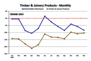 The latest Builders Merchant Building Index (BMBI) report reveals builders’ merchants’ value sales in Q4 2023 were -5.7% down compared to Q4 2022, with volume sales falling -12.0% and prices rising +7.1%. With one more trading day in Q4 2023, like-for-like sales (which take the number of trading days into account) were -7.3% down.
